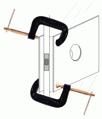 C-clamps and the undrilled plywood to avoid damaging the door.